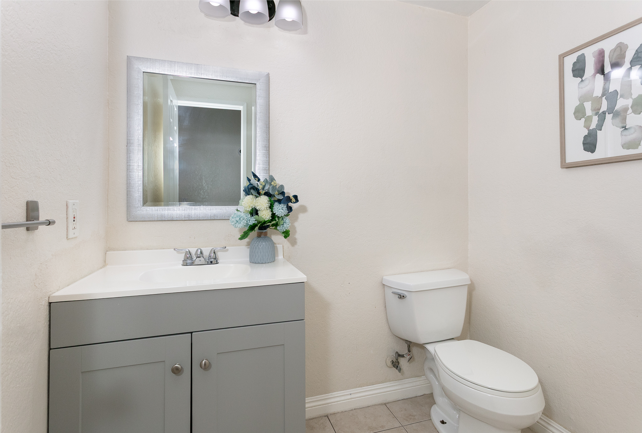 The updated kitchen includes granite countertops, stainless steel appliances, a walk-in pantry, ample cabinetry, and a pantry cabinet, offering a functional cooking workspace, along with direct access to the attached garage. A powder room also located on the main level.